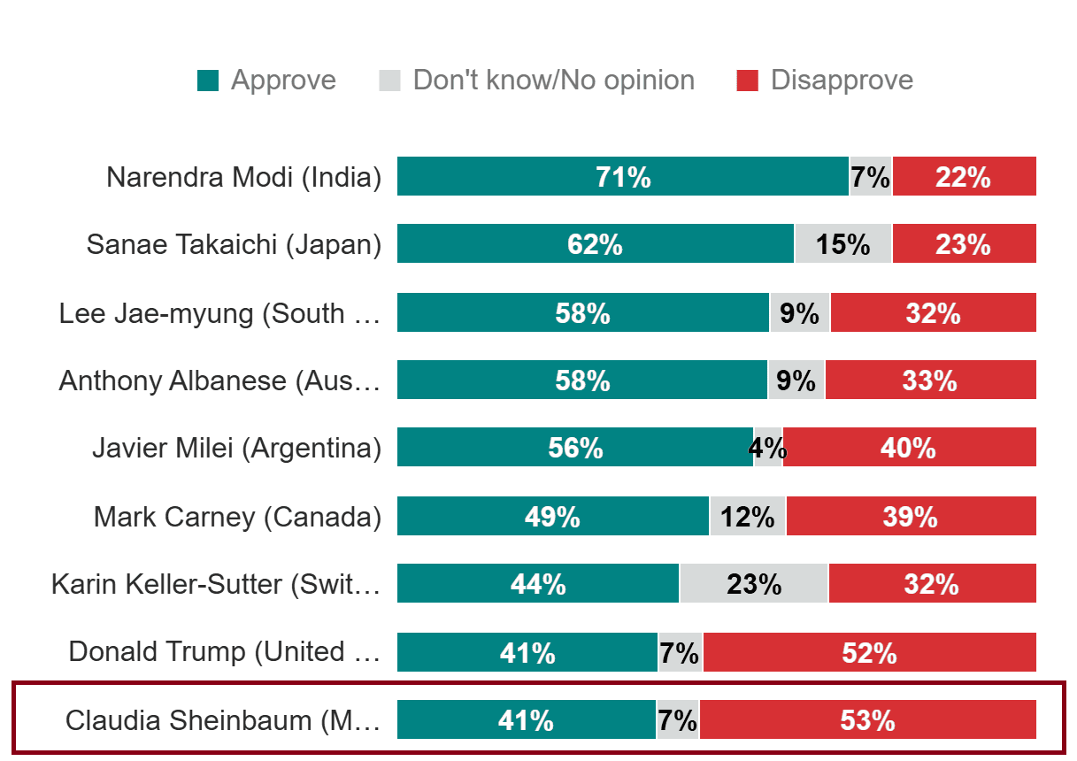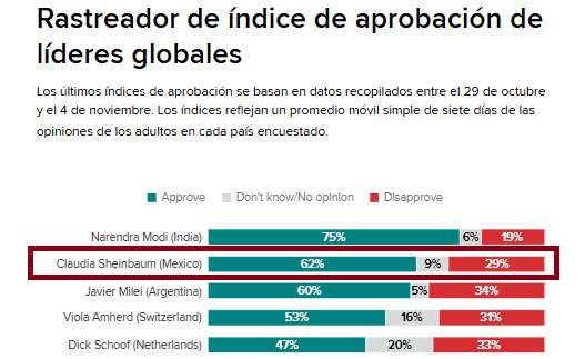Hace un año, en noviembre de 2024, al inicio de su mandato, Sheinbaum contaba con 62% de aprobación y 29% de rechazo, ubicándose en el segundo lugar entre los líderes más populares del mundo, solo detrás de Narendra Modi.