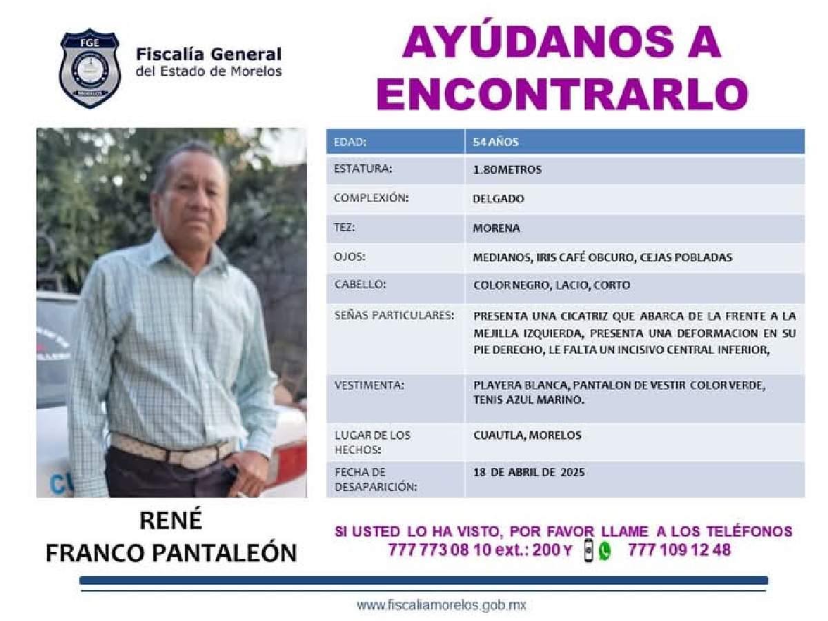 Fue el pasado 18 de abril de este año cuando René desapareció en el municipio de Cuautla; en esa ocasión vestía playera blanca, pantalón casual de color verde y tenis de color azul marino.