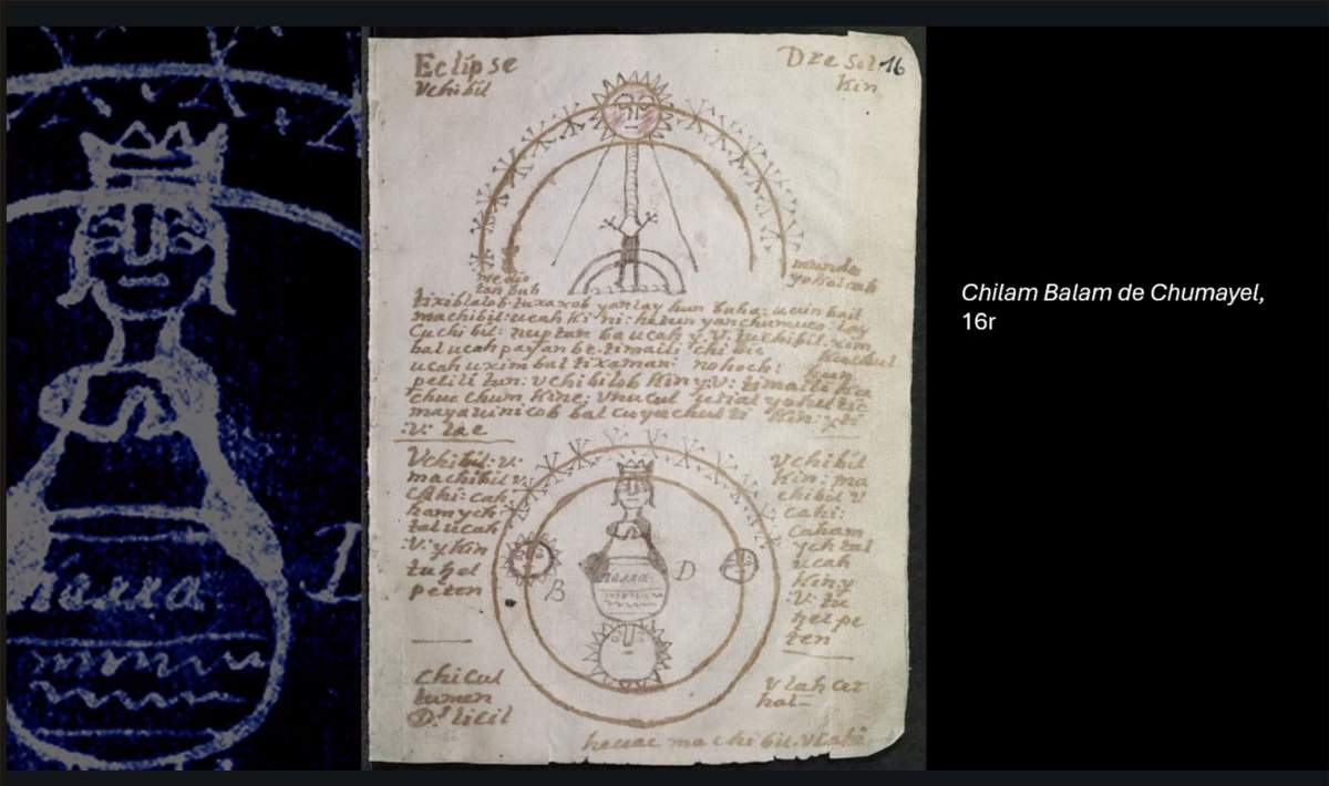 La investigadora rememoró que hay representaciones de los eclipses en el Chilam Balam de Kaua, cuyas características son diferentes, porque los fragmentos están menos reelaborados. No aparece la concepción prehispánica del astro siendo atacado, sino directamente la idea europea con copias más directas de “Cronología y Repertorio de la Razón de los Tiempos”, de Rodrigo Zamorano.
