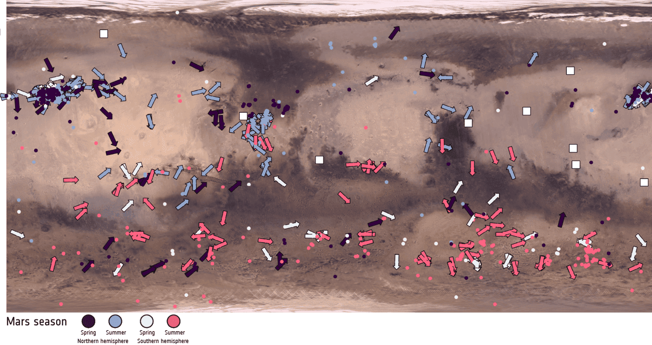Mapa que muestra los remolinos de polvo activos durante la primavera y el verano locales en los hemisferios norte y sur de Marte. / ExoMars TGO
