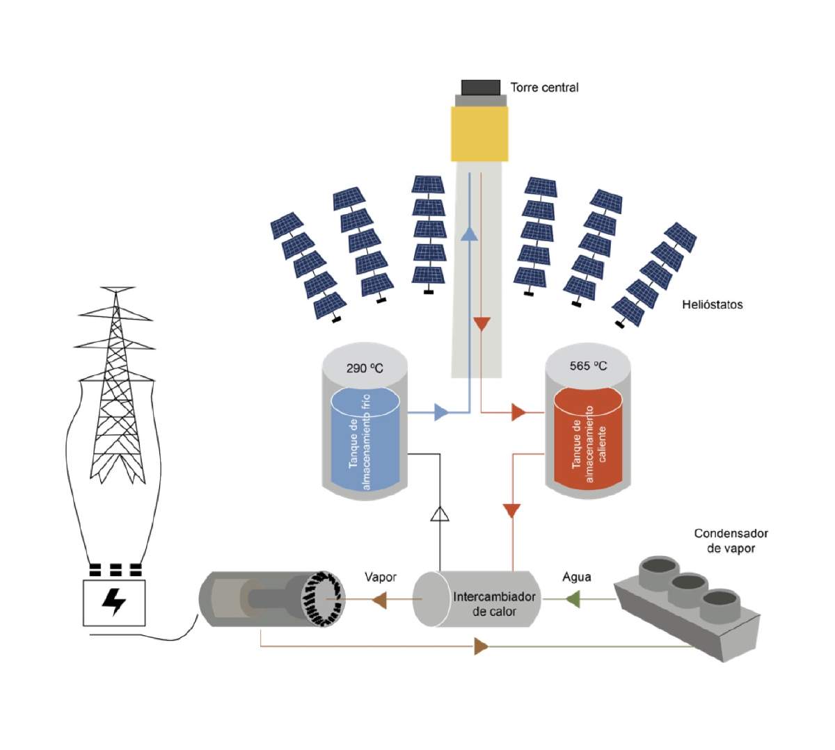Este sistema tecnológico se conoce como torre solar térmica, los espejos, llamados helióstatos, tienen la función de reflejar la radiación solar hacia el receptor (la parte alta de la torre central); están colocados en una estructura que cuenta con mecanismos de control que permiten orientarlos, de tal manera que sigan el movimiento del sol. Por su parte, el receptor (que consiste en paneles de muchos tubos) transfiere el calor recibido a un fluido de trabajo, este puede ser agua o, en otros casos, sales fundidas. Cuando el fluido es agua, se genera directamente vapor en el receptor; en cambio, cuando se utilizan sales fundidas, esas se calientan en el receptor y luego ceden su calor en un intercambiador, donde el agua se convierte en vapor. Este impulsa una turbina que hace girar al generador eléctrico y así produce la electricidad. Por supuesto, este tipo de plantas termosolares, cuenta con sistemas de almacenamiento para guardar el fluido caliente, principalmente cuando se usan sales fundidas. Esto hace posible mantener la operación durante la noche o días nublados, a diferencia del vapor, cuyo almacenamiento solo es viable por periodos cortos, de menos de una hora (Figura 1).