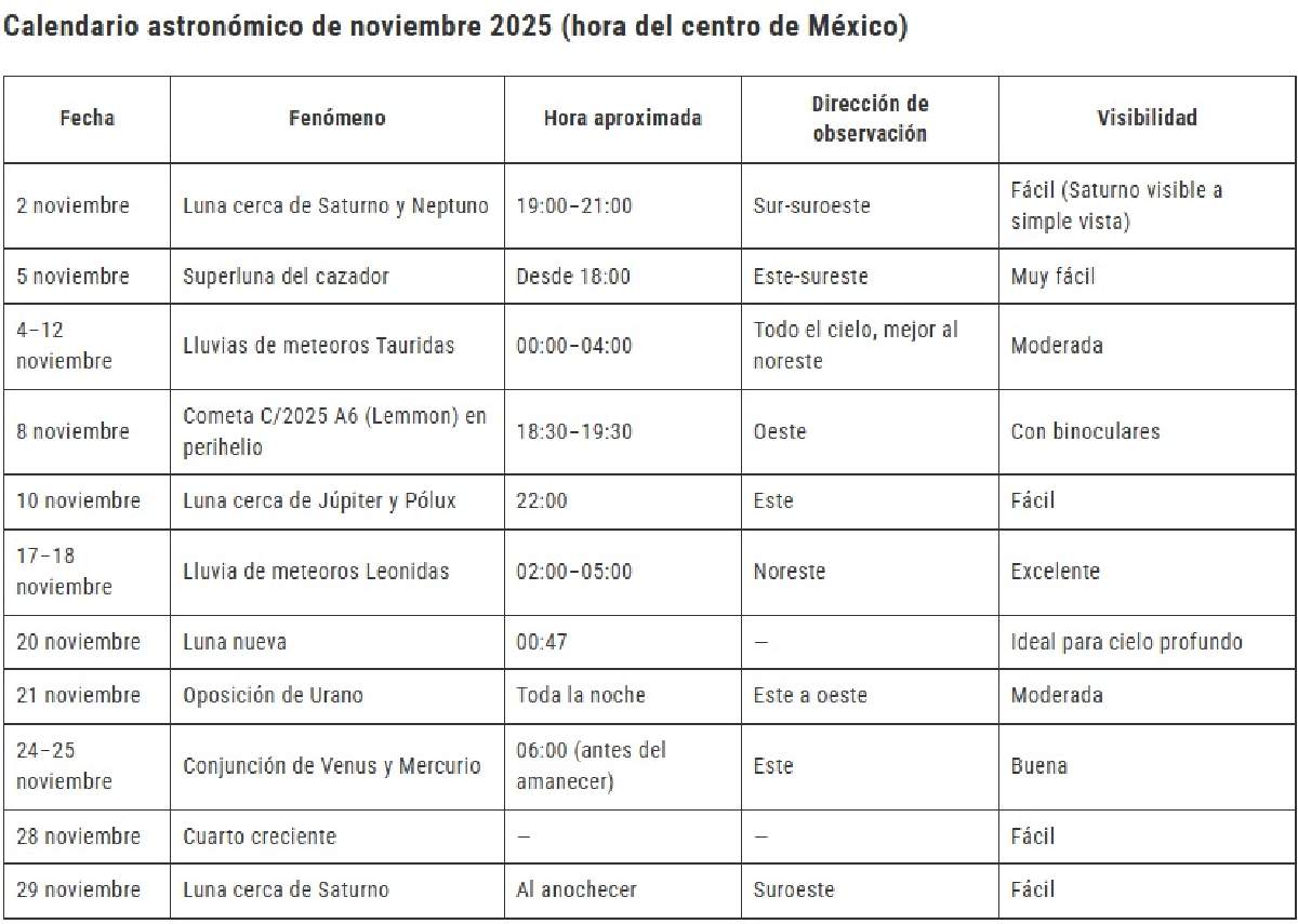 Durante noviembre, el cielo ofrecerá un repertorio excepcional de fenómenos visibles desde México: la superluna más brillante del año, el paso de un cometa, lluvias de meteoros, la oposición de Urano y una conjunción entre Venus y Mercurio al amanecer. Con cielos despejados y noches más frías, el mes será ideal para reencontrarse con el firmamento.