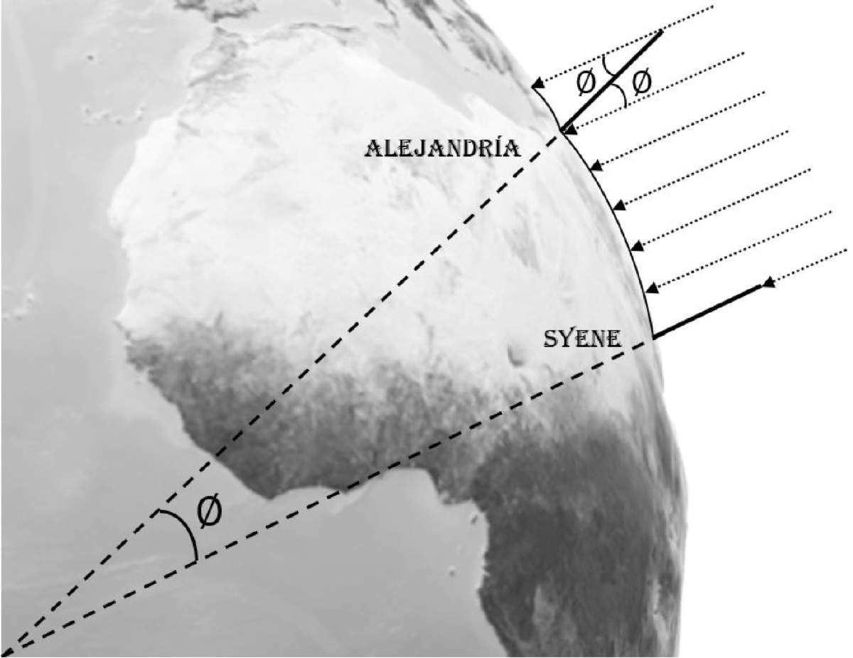 Su razonamiento se basa en principios de la Geometría. Suponía que las ciudades de Alejandría y Syene (hoy Asuán) estaban ubicadas en el mismo meridiano. Esto no es completamente correcto. La ciudad de Syene se encuentra aproximadamente a 3° de la ciudad de Alejandría. Midió la distancia entre ambas ciudades alrededor de 5,000 estadios (en unidades actuales, 925 km) y colocó en cada ciudad un gnomon, un objeto vertical con una longitud de varios metros, cuya sombra se usaba como reloj solar. Al medio día del solsticio de verano observó que el gnomon ubicado en Syene no proyectaba ninguna sombra sobre el piso, lo cual significaba que el Sol se encontraba exactamente en el cenit. Sin embargo, en el mismo momento el gnomon de Alejandría sí proyectaba una sombra que podía medirse. Así pudo asignar un ángulo a la longitud de arco de 5,000 estadios, y extrapolando a un círculo completo (360°) pudo estimar la circunferencia de la Tierra (Figura 1).