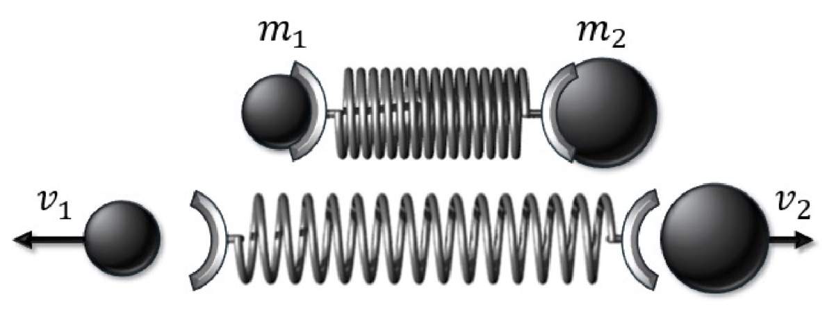 Primero se comprime el resorte colocado entre los dos cuerpos en reposo, y luego se deja expandir libremente. Después, se miden las velocidades finales de ambos cuerpos. Como ambos cuerpos partieron del reposo, el cambio de velocidad de cada uno está dado únicamente por su velocidad final. Dado que el resorte aplica la misma fuerza a cada una de las dos masas, el cambio de los dos impulsos también es igual: m1v1=m2v2.