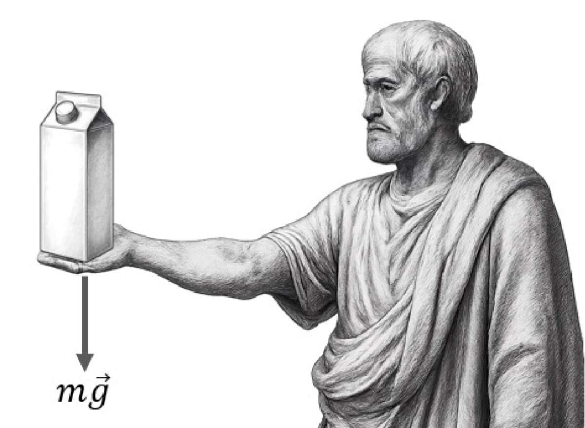 Haremos un último comentario con respecto al concepto de la masa. Primero, el movimiento en caída libre de una piedra no es debido al movimiento natural aristotélico, sino que está ocasionado por la fuerza gravitacional entre la Tierra y la piedra. Esta fuerza la podemos sentir al realizar el siguiente experimento: extienda el brazo derecho en forma horizontal, perpendicular a su cuerpo, y coloque un objeto en su mano (un envase de un litro de leche, por ejemplo). Probablemente no podrá mantener esta posición por mucho tiempo, rápidamente sentirá el peso del objeto, y el esfuerzo necesario para sostenerlo se hará cada vez más fatigoso (Figura 2).