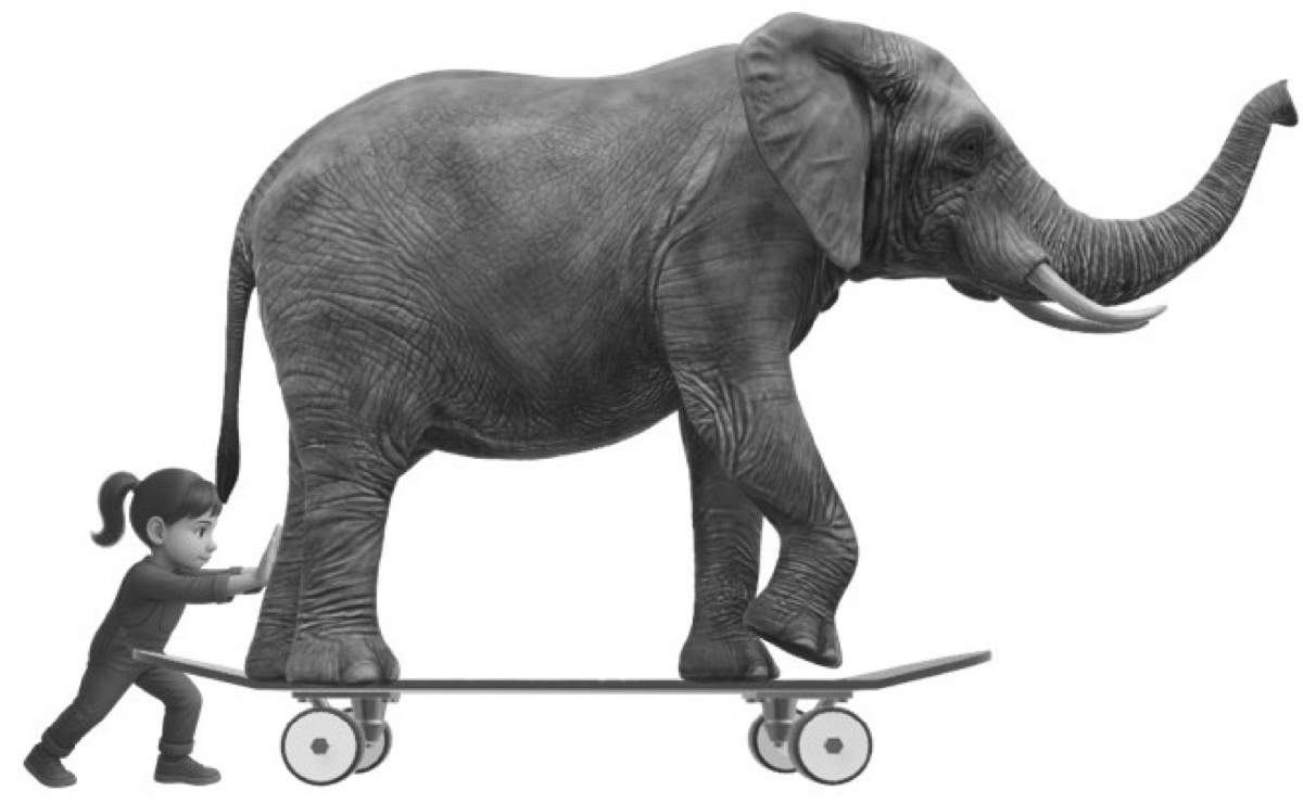 Ya estamos listos para resolver el acertijo de la semana pasada, ilustrado en la Figura 3. Si no existe fricción, ¿podría la niña mover al elefante? La respuesta es un resonante sí. Si la niña aplica una pequeña fuerza, esto se traduce en la masa del elefante multiplicada por una aceleración, de acuerdo con la segunda ley de Newton. Es decir, el cociente entre la fuerza que aplica la niña y la masa del elefante es una cantidad pequeña igual a la aceleración del elefante. Pero si esa pequeña fuerza se aplica durante mucho tiempo, el elefante seguirá aumentando su velocidad, poco a poco, hasta alcanzar valores muy grandes.