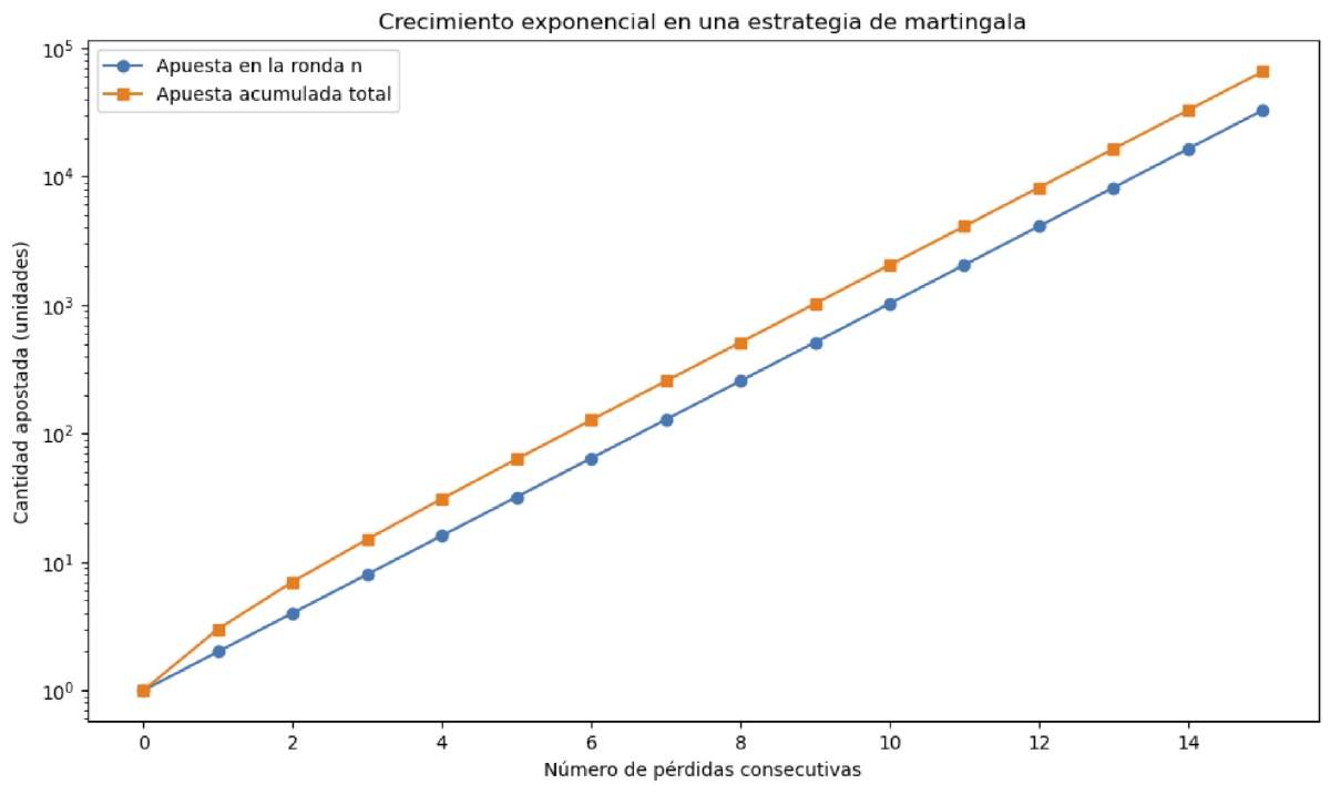 Tompkins estaba convencido. Su lógica parecía impecable. Pero el profesor (su suegro), con tono sereno y experto, lo confrontó con una verdad tan simple como devastadora: ¡nadie tiene recursos infinitos! En la vida real, los jugadores se enfrentan a límites, tanto de dinero como de tiempo. Y ante una mala racha prolongada, el crecimiento exponencial de las apuestas requeridas se vuelve insostenible. Con solo 10 pérdidas consecutivas, el jugador tendría que apostar más de mil dólares; con 15, más de treinta mil. Todo, para ganar un solo dólar (Figura 1).