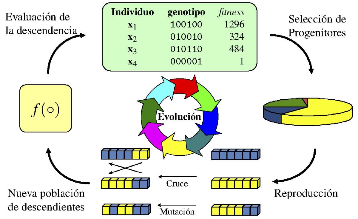 Figura 3. Esquema del funcionamiento de un algoritmo genético (AG). Cada individuo se representa mediante un genotipo (cadena de bits) y se evalúa según una función de aptitud (fitness). Los más aptos se seleccionan como progenitores, se combinan por cruce, y algunos “genes” sufren mutaciones aleatorias. Con ello se forma una nueva población de descendientes, que vuelve a evaluarse. Este ciclo iterativo de selección, reproducción, cruce y mutación permite que la población “evolucione” hacia soluciones cada vez mejores (Imagen tomada de la ref. [9]).