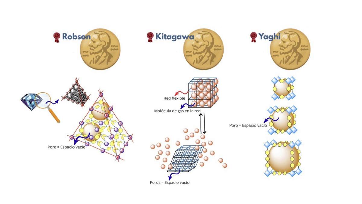 El premio Nobel de Química fue anunciado por la Real Academia Sueca de Ciencias durante las primeras horas del miércoles 8 de octubre, y la buena noticia fue para tres científicos que han dedicado sus carreras al desarrollo de las llamadas redes metal-orgánicas (Metal-Organic Frameworks o MOFs). Este año, el galardón se comparte entre Richard Robson, Susumu Kitagawa y Omar Yaghi, quienes actualmente son profesores en las universidades de Melbourne, Kioto y California, respectivamente. Estos tres científicos sentaron las bases para un nuevo tipo de arquitectura molecular: “son arquitectos en lo invisible”. Las construcciones que han creado, las redes metal-orgánicas, contienen cavidades, espacios vacíos imperceptibles a nuestros ojos, a través de los cuales pueden fluir gases y otras sustancias. Se dice entonces que las redes metal-orgánicas tienen la capacidad de albergar y liberar distintas moléculas, debido a su naturaleza altamente porosa.
