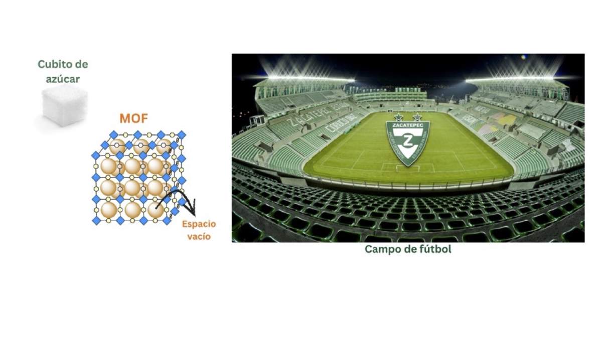 Las redes metal-orgánicas son porosas y sus poros pueden ser llenados por otras sustancias. Y, aunque esto pudiera sonar trivial, sus implicaciones son bastante impresionantes: un solo cubo de MOF del tamaño de un terrón de azúcar puede encerrar una superficie interna equivalente a la de la cancha de un estadio de fútbol asociación (Figura 2). Esto significa que las redes metal-orgánicas pueden almacenar mucho más material en su interior de lo que aparentemente se observa al mirarlas desde el exterior.