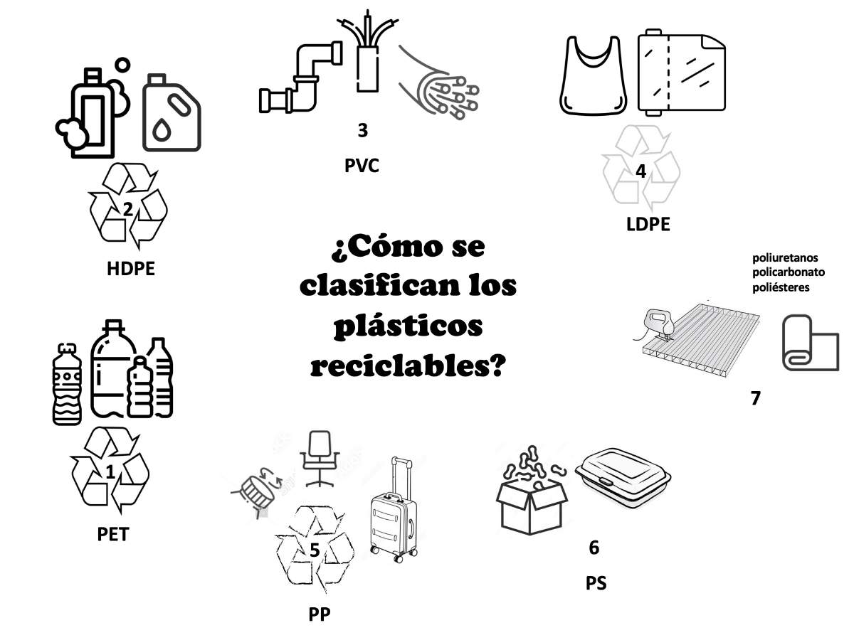 Figura 2. Tipos de plásticos reciclables, el número que los identifica y ejemplos de los productos donde podemos encontrarlos. Figura elaborada a partir de imágenes provenientes de https://www.flaticon.com/ y https://www.pexels.com/es-es/