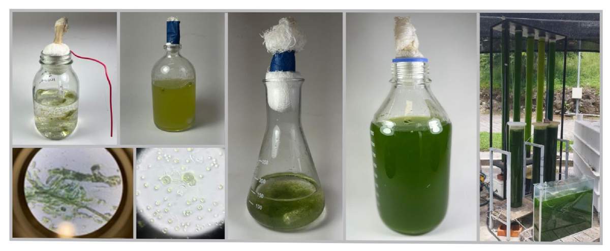 Figura 2. Desde un frasco casero hasta un fotobiorreactor: las microalgas pueden cultivarse en recipientes simples para uso educativo o en sistemas controlados como los del Instituto de Energías Renovables de la UNAM.