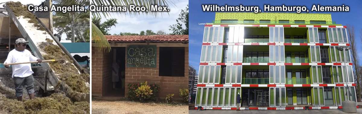 Figura 3. Casa Angelita, construida con bloques de sargazo (Foto: SIPSE). La casa de las algas en Alemania (Foto: Googlemaps) con paneles de biorreactores de algas para calefacción y producción de energía.