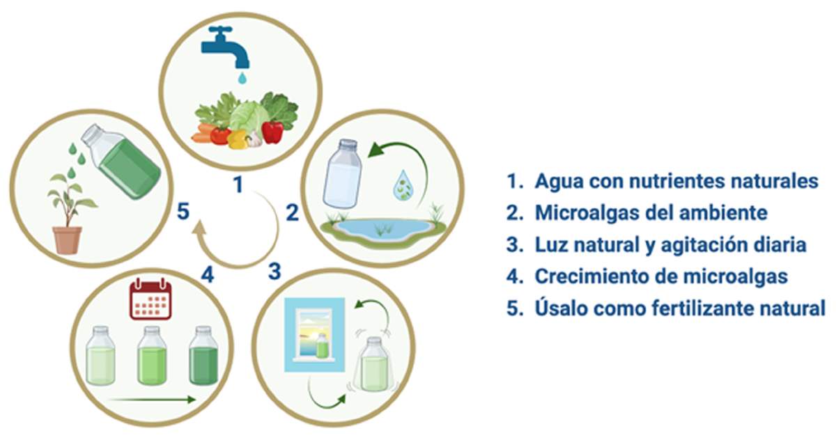 En pocos días, el líquido comenzará a tornarse verde: ese color es señal de que las microalgas están activas y realizando fotosíntesis. Con este pequeño cultivo, estarás participando en un ciclo natural: las microalgas absorben el CO2 del aire y liberan oxígeno, ayudando a mejorar la calidad del ambiente inmediato. Cuando el cultivo se vuelva más denso, puedes diluir una parte para continuar tu cultivo de microalgas y la otra puedes utilizarla para para regar tus plantas, ya que las microalgas liberan compuestos que enriquecen el suelo y aportan nutrientes naturales sin necesidad de fertilizantes químicos. De esta manera, lo que comenzó como un pequeño experimento en casa puede convertirse en una fuente constante de fertilizante orgánico, reduciendo el uso de productos químicos y cerrando pequeños ciclos de aprovechamiento.