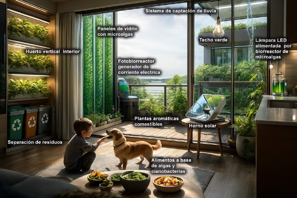 Las microalgas son mas que una decoración, y no solo son simples microorganismos que tiñen de verde el agua o adornan laboratorios y espacios. Las microalgas nos recuerdan que el futuro no siempre llega con grandes máquinas o tecnologías deslumbrantes; a veces llega en forma de diminutos seres verdes capaces de construir un mundo más limpio y sostenible. Cuando las integramos en nuestro entorno, no solo aprovechamos su capacidad para generar energía, limpiar el aire o producir biomasa, sino que también recuperamos una conexión profunda con la naturaleza. Podemos imaginar muros que respiran, ventanas que capturan luz para convertirla en seres vivos y edificios que colaboran activamente con el planeta produciendo su energía (Figura 5). De esta manera, esto dejará de ser ciencia ficción y se convertirá en una posibilidad real. Desde el laboratorio, estos increíbles microorganismos nos invitan a soñar con ciudades vivas, donde cada superficie trabaja silenciosamente por un mañana más limpio. Son un recordatorio poderoso de que la sostenibilidad no es un lujo, sino una forma de reconciliarnos con la naturaleza, permitiendo que incluso los organismos más pequeños iluminen nuestro camino hacia un futuro más armónico.