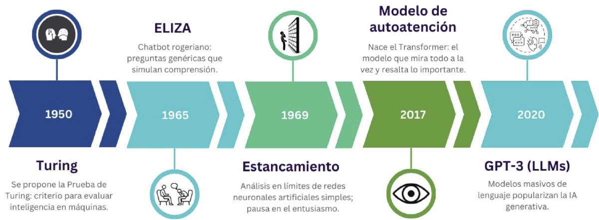 Figura 1. Línea del tiempo de acontecimientos históricos clave para el desarrollo de los modelos de lenguaje modernos.