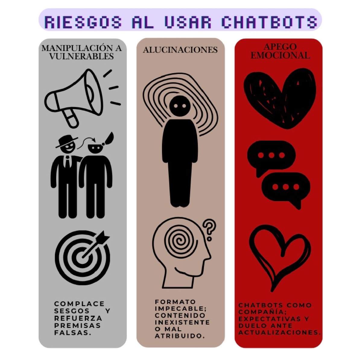 Figura 3. Riesgos asociados al uso no constructivo de modelos de lenguaje. El usuario puede inadvertidamente ser manipulado, engañado por información errónea, o generar un apego emocional perjudicial.