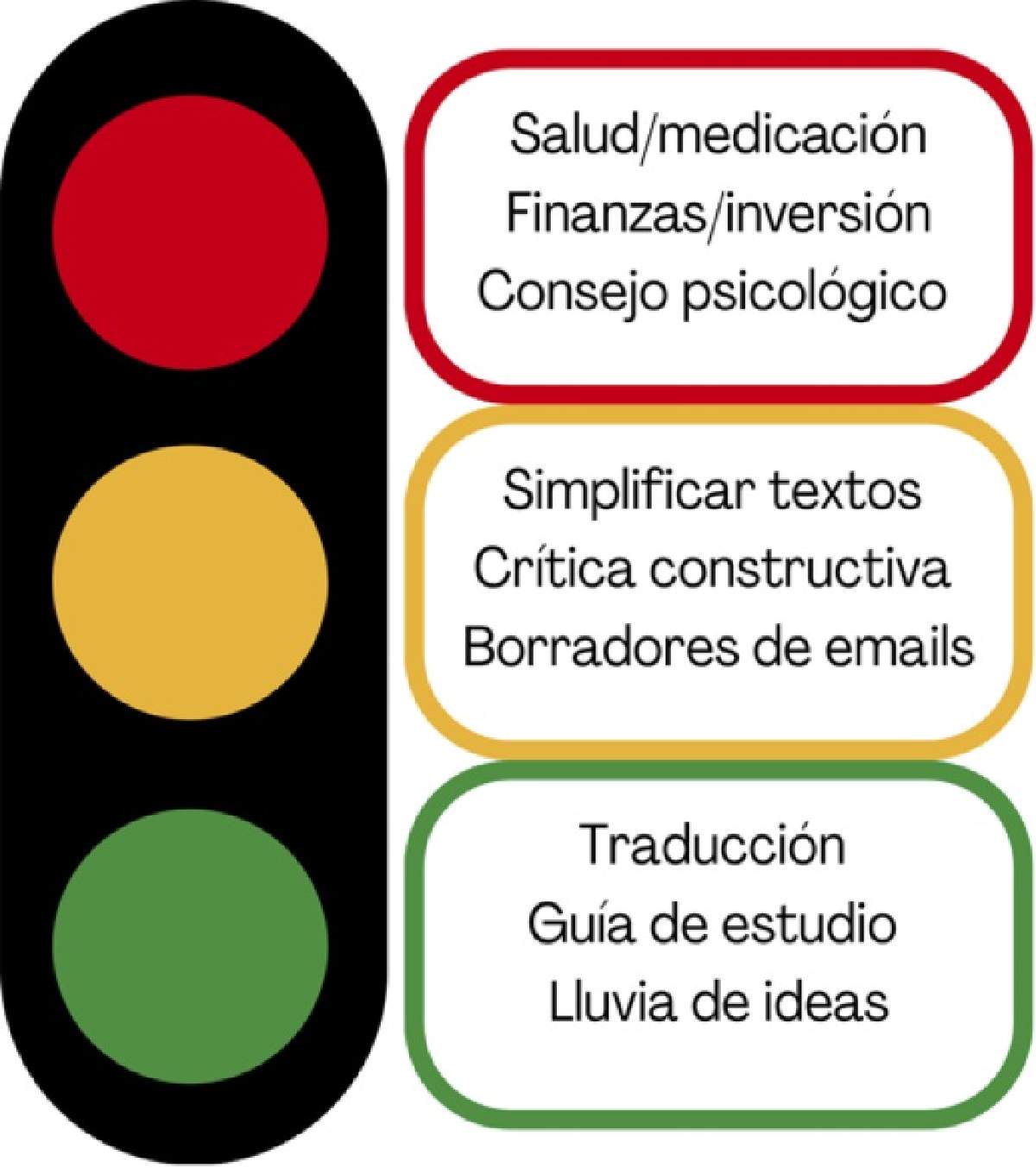 Figura 4. Recomendaciones para la identificación de usos de riesgo (rojo), usos neutrales que requieren de verificación humana (amarillo), y usos constructivos que pueden apoyar el flujo de trabajo o estudio del usuario (verde).