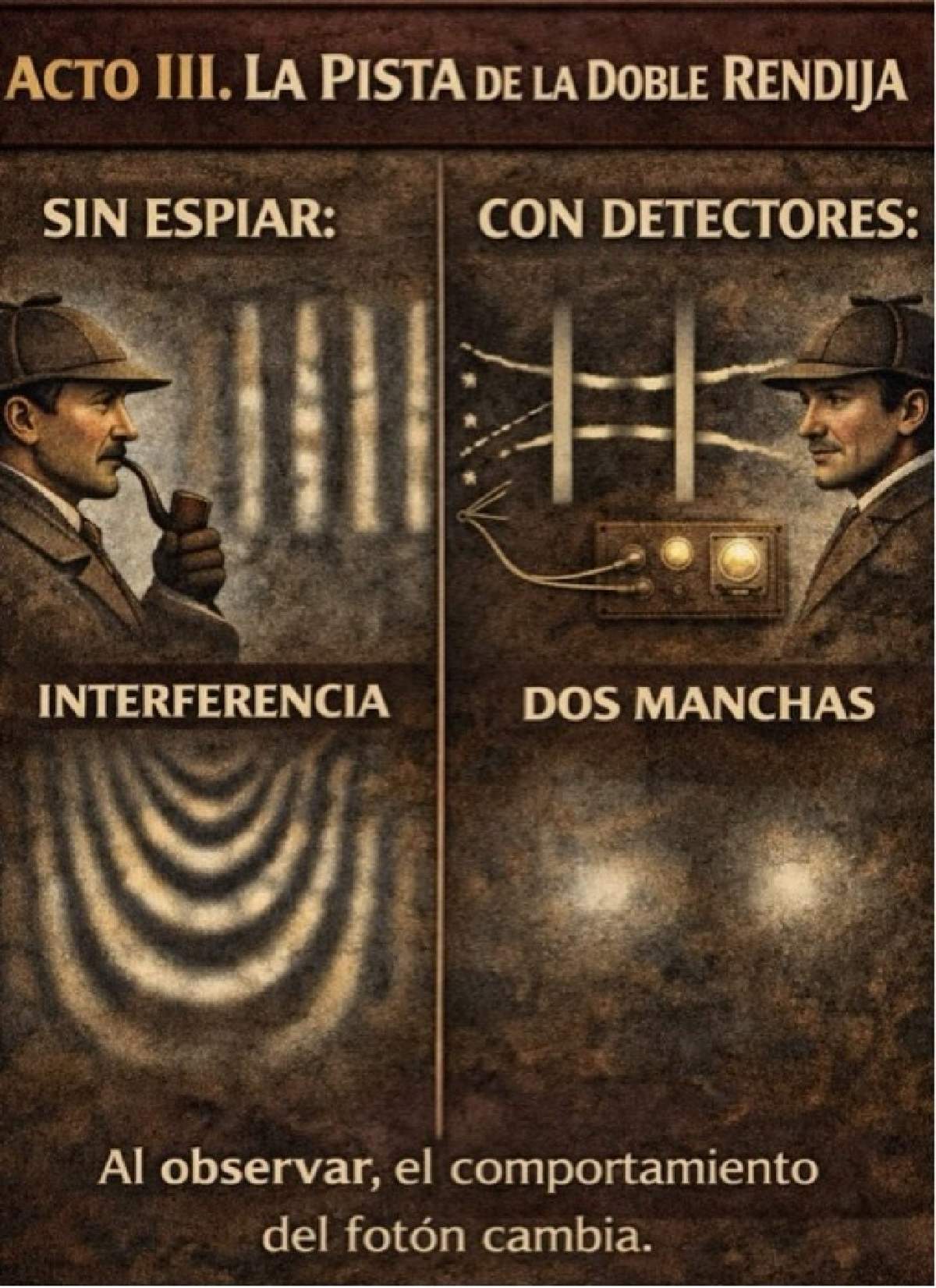 Holmes describe el famoso experimento: Sin espiar, los fotones, lanzados uno por uno, forman un patrón ondulatorio: bandas claras y oscuras. Como si fueran ondas que interfieren. A veces se anulan, a veces se duplican.