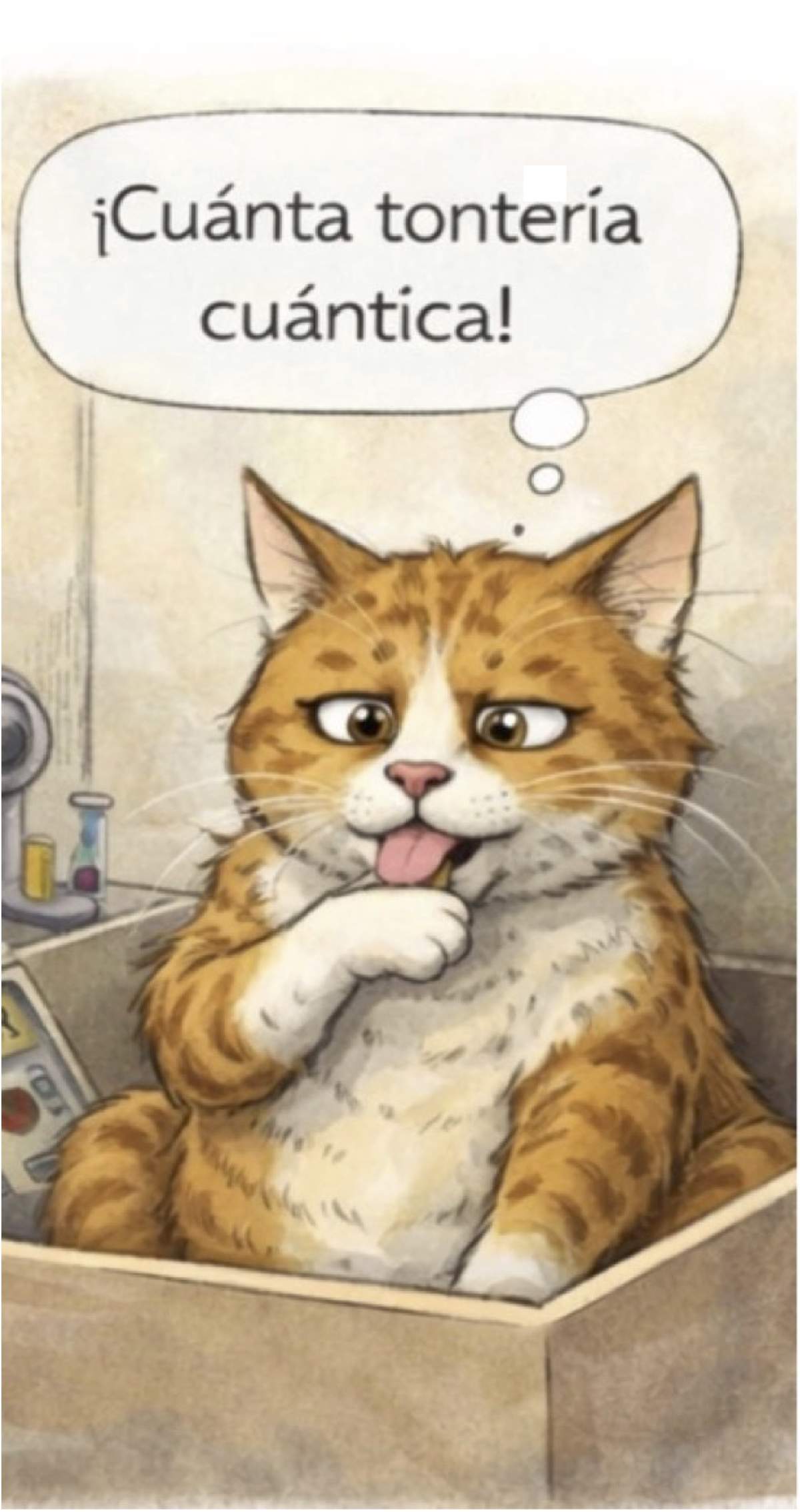 Saltó fuera de la caja con la cola bien erguida, dejando atrás el misterio cuántico (Figura 6). Tenía asuntos más importantes que atender, como exigir la amplificación inmediata de su cena. Algunos registros irreversibles, después de todo, se escriben mejor en una buena lata de atún.