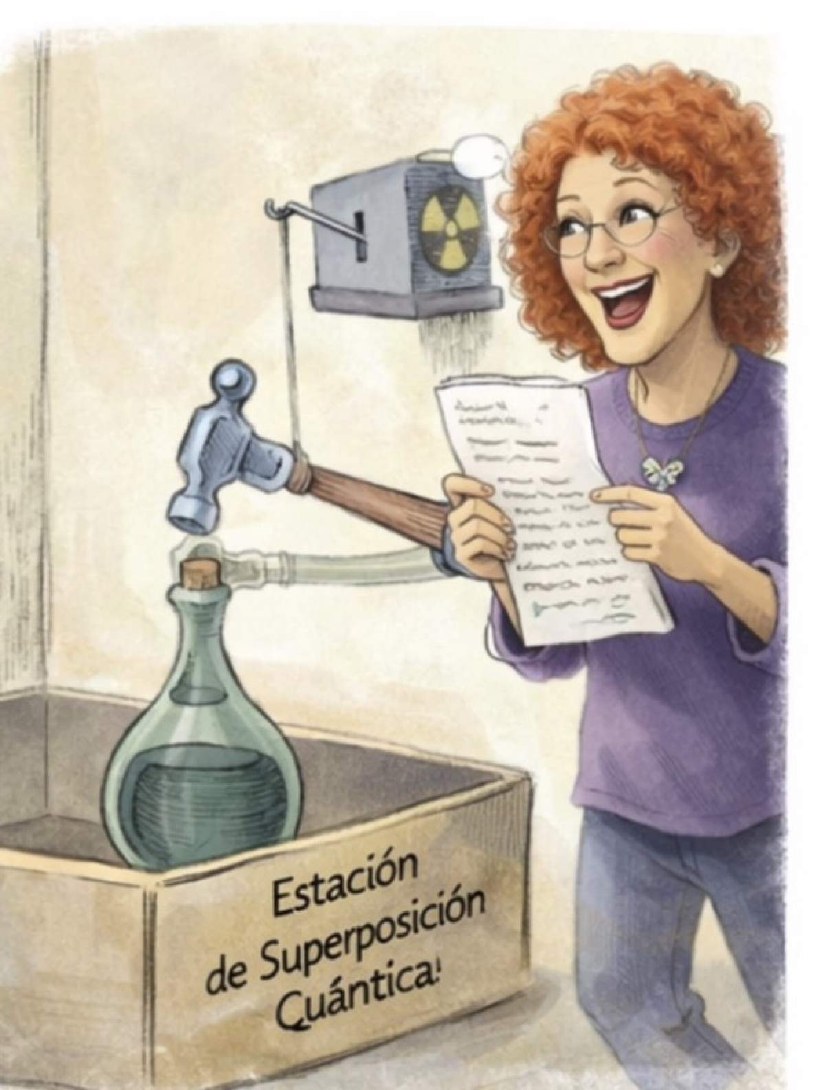 Su dueña, una física bienintencionada pero filosóficamente distraída llamada Julia, lo había colocado dentro de una caja bastante espaciosa. Tenía cojines, un plato con agua y una pequeña placa que decía “Estación de Superposición Cuántica” (Figura 1). El problema no era la caja en sí, sino el dispositivo escandalosamente elaborado que había dentro: un frasco de veneno, un átomo radiactivo, un contador Geiger y un martillo, todo conectado con lo que solo podía describirse como un entusiasmo peligrosamente excesivo.
