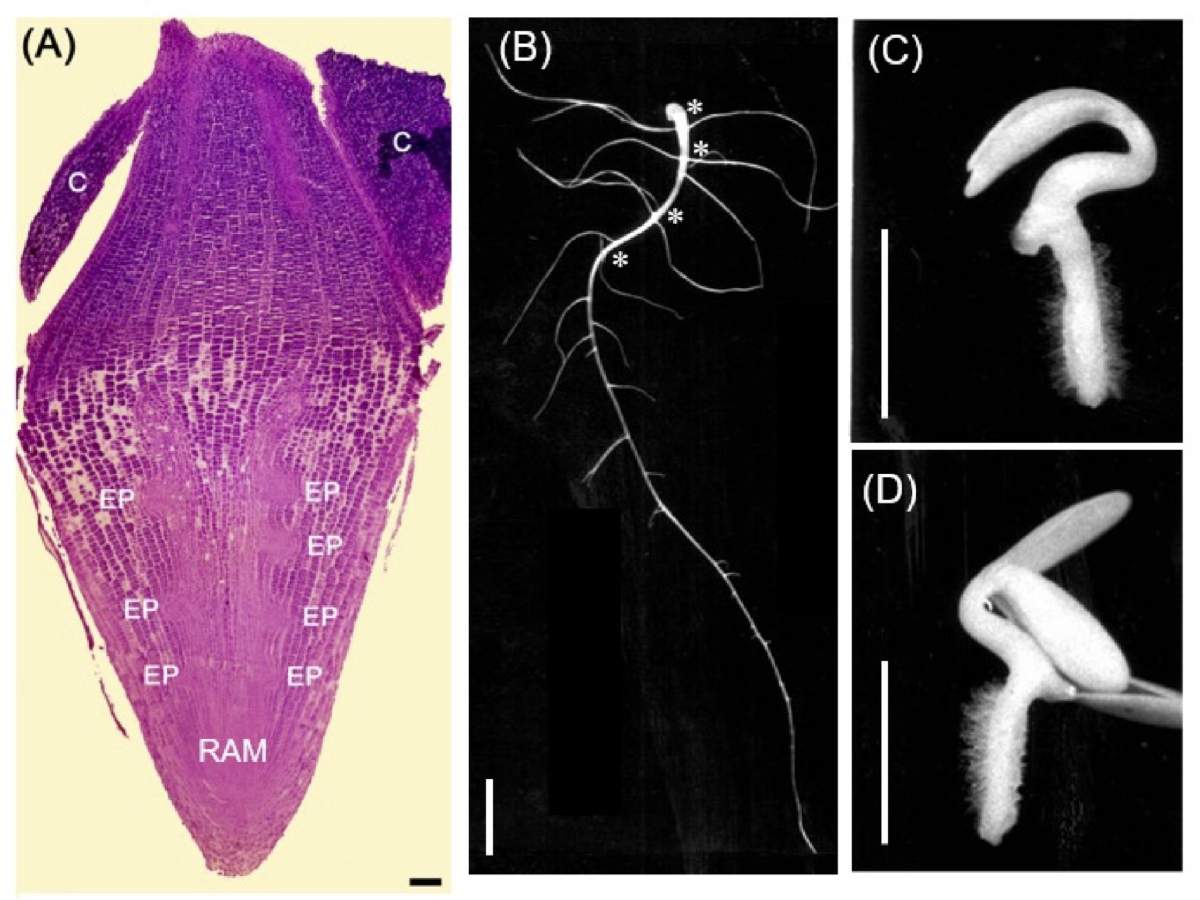 Figura 2. Plantas de pepino (Cucumis sativus) como objeto de estudio de efectos citostáticos de compuestos químicos. (A) Embrión maduro de la planta de pepino. RAM, meristemo apical de la raíz; EP, primordios embrionarios de las raíces laterales; C, cotiledones. (B) La raíz de plántula de pepino sin tratamiento, 4 días después de germinación. Noten que primeras cuatro agrupaciones de raíces laterales que crecen a partir de la raíz primaria son raíces laterales de origen embrionario (marcados con asteriscos). (C) y (D) plántulas de la misma edad tratadas con 10 µg/ml de Cisplatino diluido en agua (C) y plántulas germinadas en agua a partir de semillas irradiadas con rayos X a una dosis de 1000 Gray. Barra in (A) = 100 µm, (B)-(D) = 10 mm; 1000 µm corresponde a 1 mm (Imágenes modificadas tomadas de (7, 8, 12).