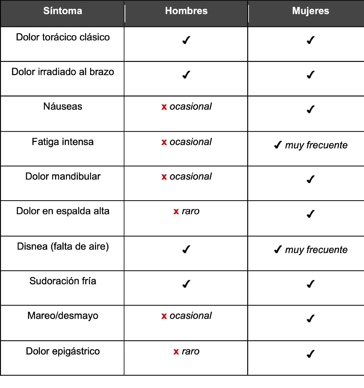 Un episodio tan frecuente como un infarto cardiaco, suele presentarse como un dolor torácico opresivo en hombres, pero en las mujeres es más común que presenten síntomas diferentes, como fatiga extrema, náuseas o dolor dorsal. Estos síntomas han sido etiquetados durante años como “atípicos”, lo que conduce a diagnósticos tardíos y tratamientos menos agresivos (Figura 4).