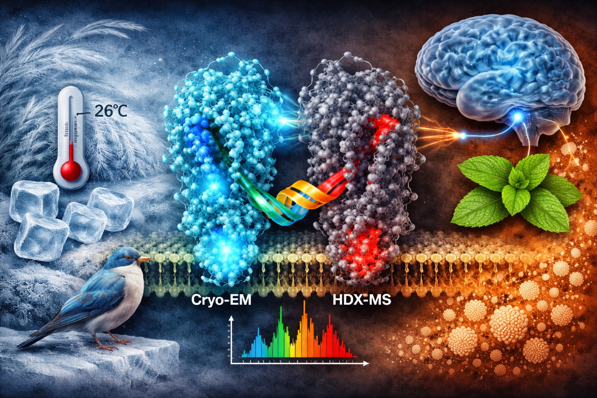 Para ello combinaron la criomicroscopía electrónica (cryo-EM), que produce imágenes estáticas, con la espectrometría de masas de intercambio de hidrógeno-deuterio (HDX-MS), más adecuada para ver movimientos. Esto permitió observar en tiempo real cómo la proteína se abre y qué partes de su estructura se flexionan al enfriarse el ambiente.