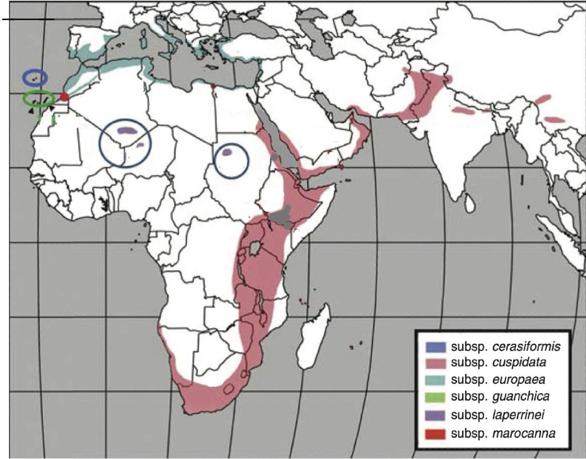 Figura 1. Localización geográfica de las distintas subespecies de Olivos. Modificado de: Annals of Botany 121: 385–403, 2018, doi:10.1093/aob/mcx145