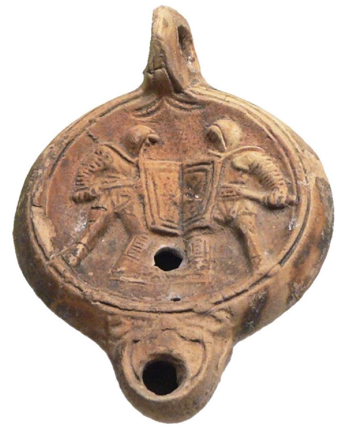 Figura 3. Lámpara de aceite romana (Lucerna). Fuente: https://es.wikipedia.org/wiki/Lucerna_%28l%C3%A1mpara%29#/media/Archivo:Gladiator-%C3%96llampe.jpg