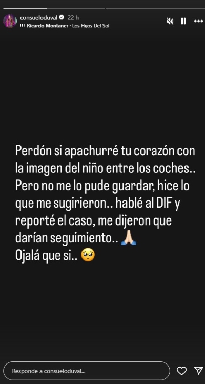 “Perdón si apachurré tu corazón con la imagen del niño entre los coches, pero no me lo pude guardar, hice lo que me sugirieron, hablé al DIF y reporté el caso, me dijeron que darían seguimiento. Ojalá que sí”, señaló.