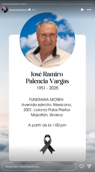 El compositor y cantante sinaloense Horacio Palencia confirmó el fallecimiento de su padre, don Ramiro Palencia, ocurrido la madrugada del jueves 9 de octubre alrededor de las 4:40 horas, tiempo del Pacífico.