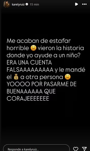 Sin embargo, poco después descubrió que la cuenta era falsa y que el dinero había sido recibido por otra persona. Ante la situación, Karely compartió su molestia en redes: “Me acaban de estafar, ¡qué coraje! Por pasarme de buena onda… horrible”.