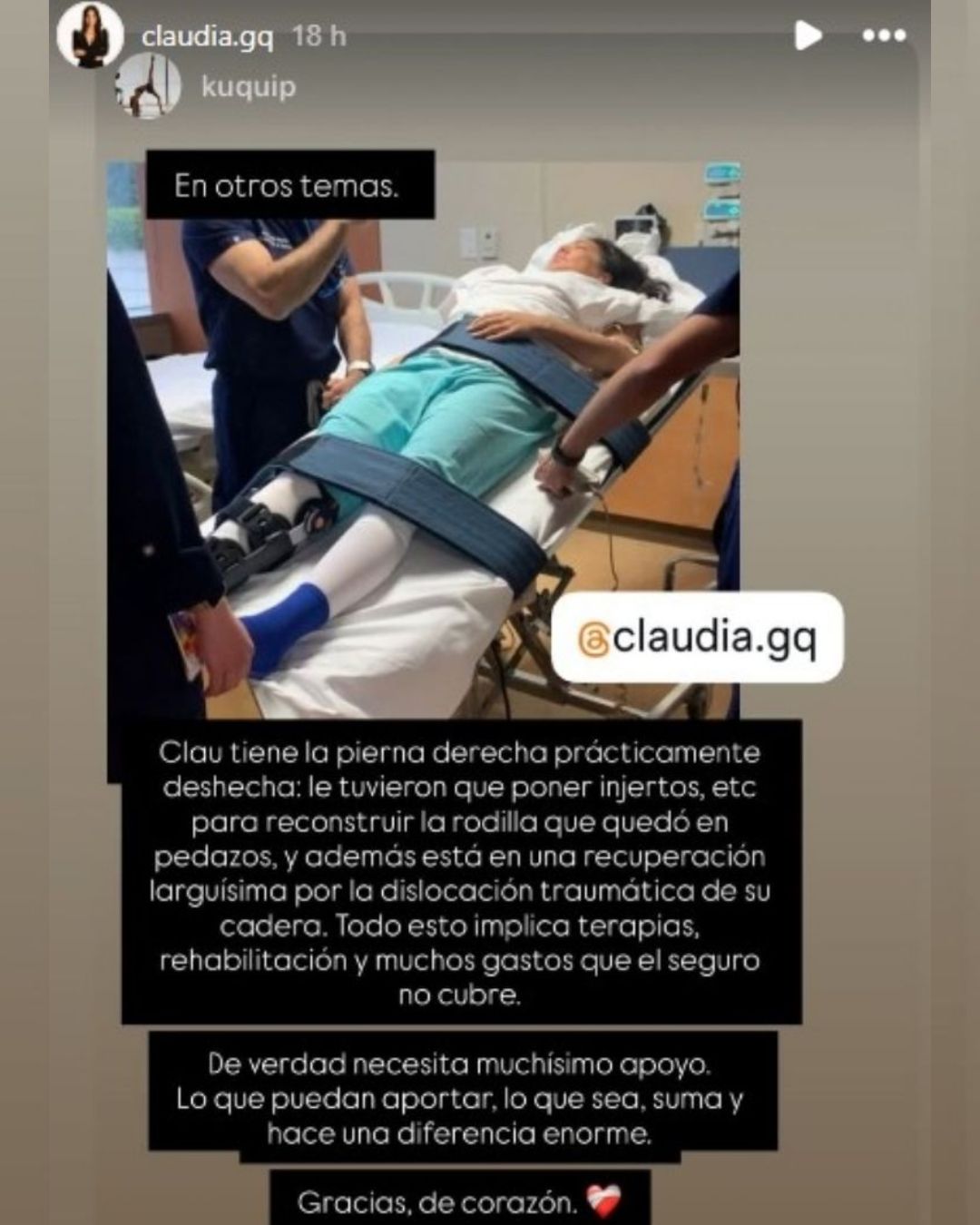 Según información difundida en la campaña de apoyo, Claudia sufrió dos lesiones graves en la pierna derecha, dislocación de cadera y daño en la rodilla, que requirió injertos para su reconstrucción. Su recuperación se anticipa como un proceso largo y complicado.