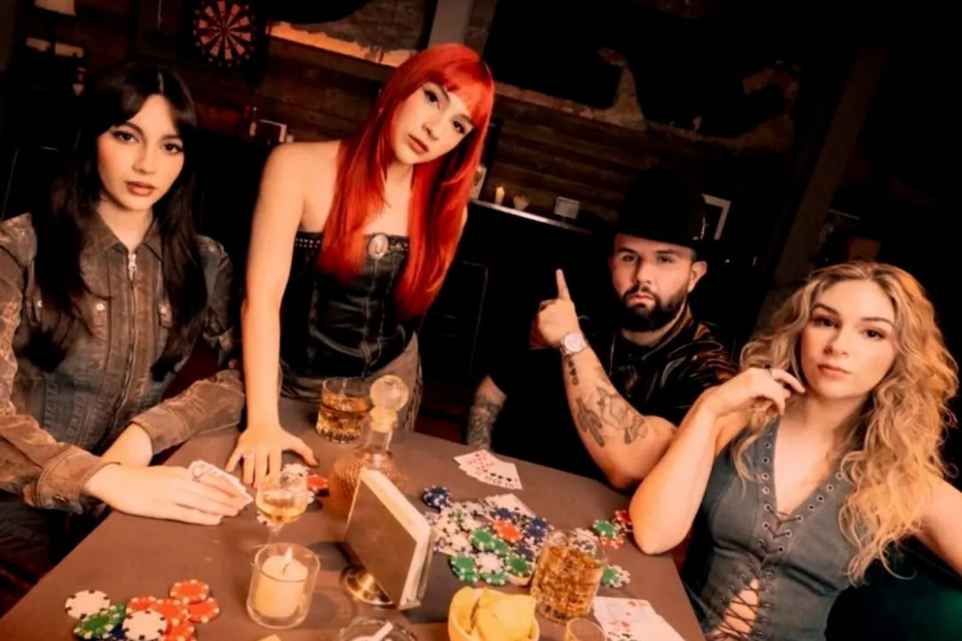La historia se desarrolla en un bar, donde la banda y Carín León comparten escena entre cartas, mesas de billar, dardos y máquinas tragamonedas.
