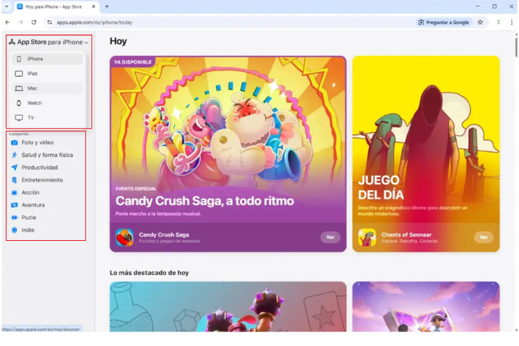 La nueva App Store web adopta un formato muy similar al de sus versiones en iPhone, iPad o Mac, comenzando con la pestaña “Hoy”, donde se muestran recomendaciones personalizadas, eventos destacados, selecciones editoriales y novedades de apps y juegos.