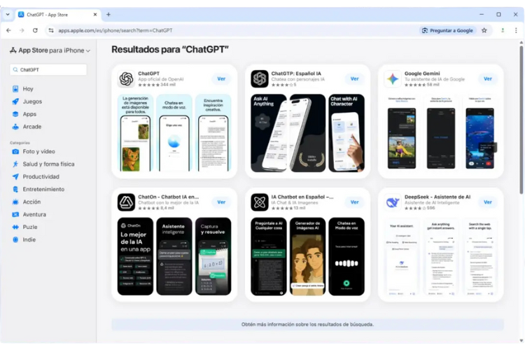 Ahora, la nueva App Store permite buscar directamente dentro de la plataforma, mostrando resultados precisos y sugerencias relacionadas, como ChatGPT, Gemini o DeepSeek.