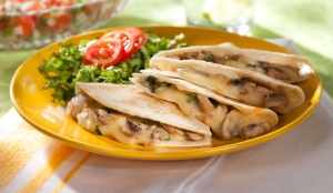 3._ Calienta las tortillas en un comal, coloca una porción de champiñones y queso al centro, y dóblalas a la mitad.