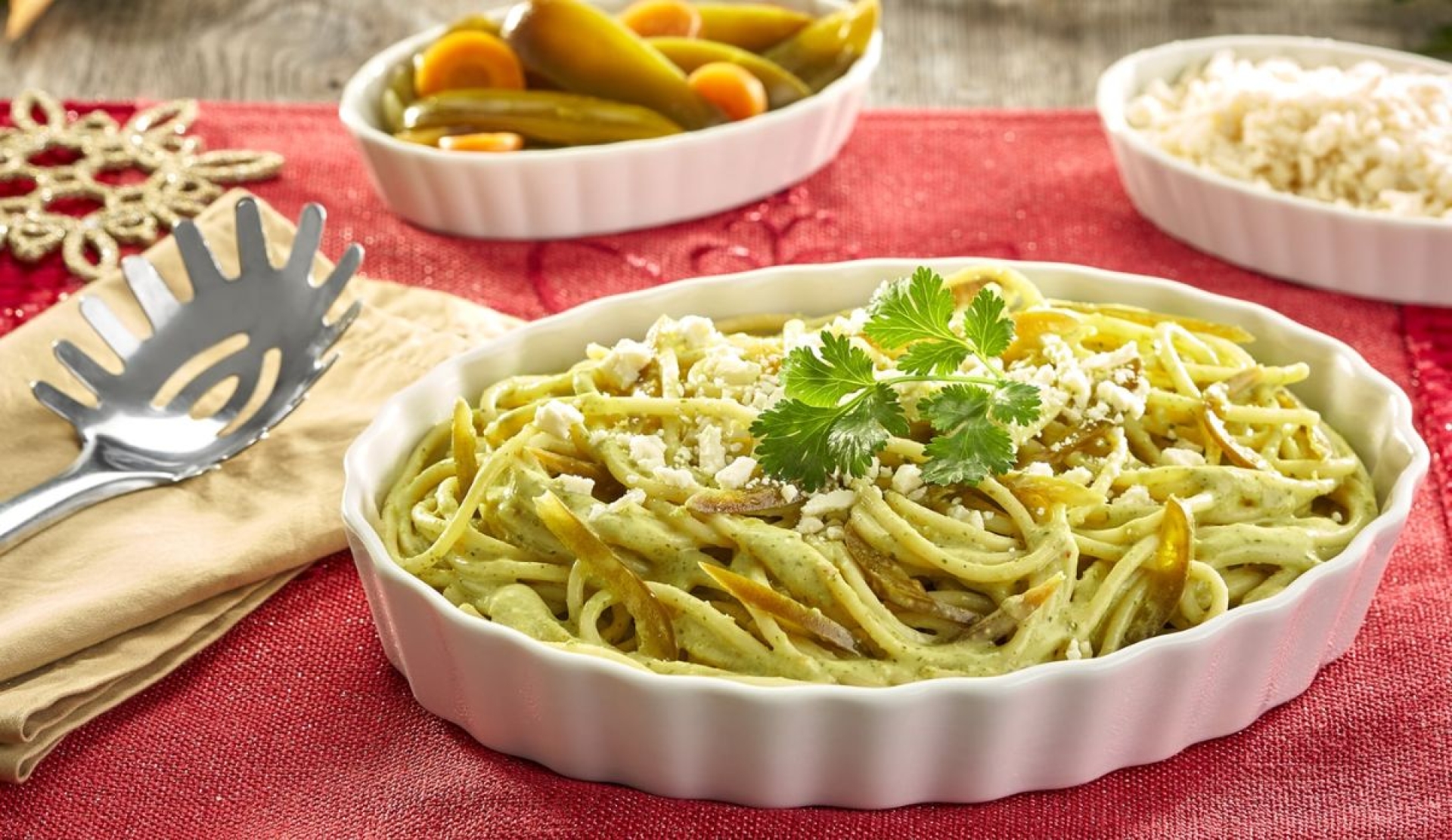 La pasta, en cualquiera de sus presentaciones, suele ocupar un lugar especial en la mesa mexicana durante la cena navideña. Generalmente aparece como acompañamiento del pavo relleno o del lomo, en versiones cremosas y llenas de sabor. Sin embargo, hay recetas que brillan por sí solas y se convierten en un complemento ideal para estas fechas, como este espagueti verde.
