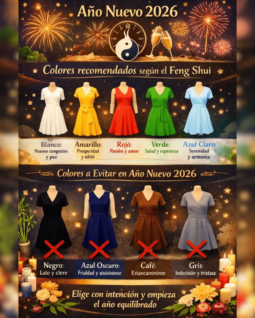 Bajo esta visión, el Feng Shui, filosofía china enfocada en la armonía energética, sugiere prestar especial atención a los colores elegidos para la noche del 31 de diciembre, ya que cada tono puede potenciar distintas intenciones para el año entrante.