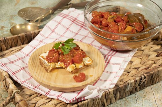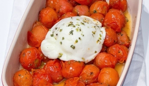 Se trata de un snack de queso con tomates cherry, ideal como entrada o botana. Su preparación es simple y el resultado, cremoso y aromático, combina bien con pan crujiente para servirse al centro de la mesa.