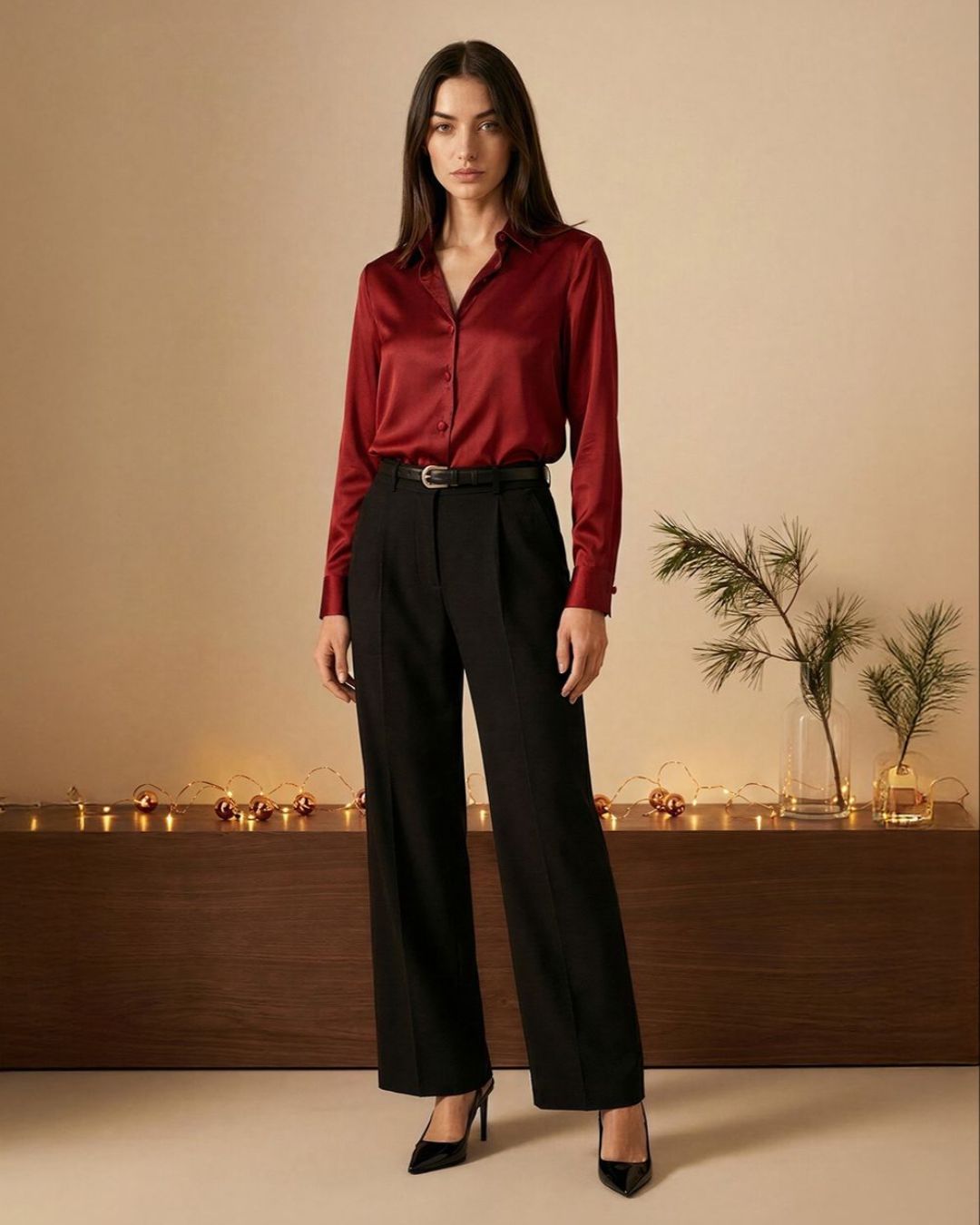 Los cortes rectos o amplios en tonos oscuros se complementan con blusas de satén, especialmente aquellas con lazada o cuello especial.