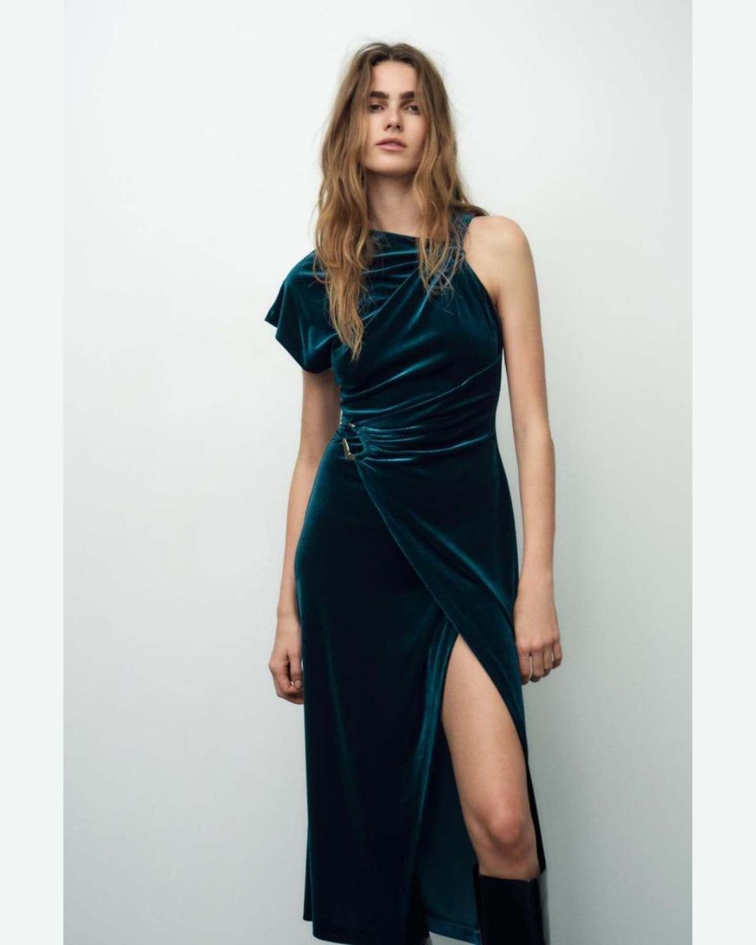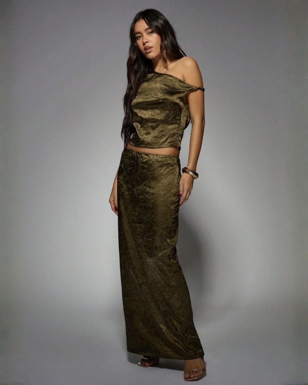 Este tejido destaca en invierno por su textura envolvente y brillo natural. Los modelos a media pierna, con mangas largas o tres cuartos, lucen especialmente bien en tonos vino o negro.
