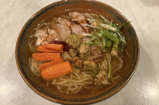 Hierve la carcasa con verduras para crear un caldo potente. Agrega fideos de pasta delgada, un huevo tibio y láminas de pavo.