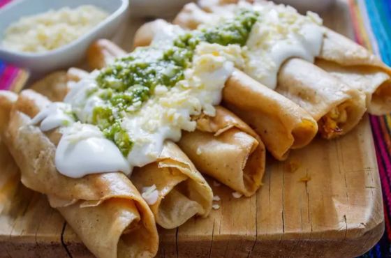 Deshebra el pavo, la pierna o el lomo y mézclalo con un poco de su propia salsa para que no quede seco. Rellena tortillas de maíz y dóralas en aceite caliente hasta que estén crujientes. Sirve con lechuga, crema, queso y salsa verde o roja.