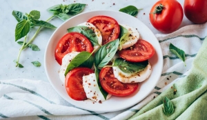 • Acomoda de forma alternada el tomate y el queso en un plato amplio. Integra hojas de albahaca entre cada capa para realzar el aroma.