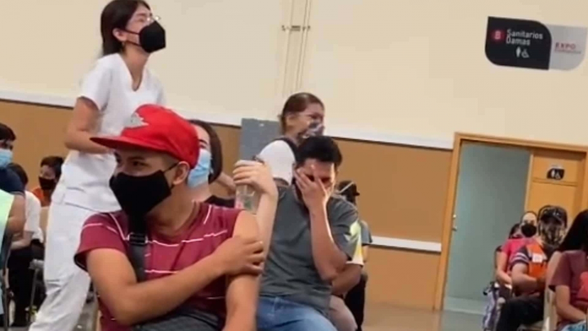 En las imágenes se ve a un hombre que viste pantalón de mezclilla y una playera gris, de manga corta, además de portar su respectivo cubrebocas, pero cuando la enfermera que le va a poner la vacuna se acerca con la jeringa, de inmediato el sujeto grita, se voltea y comienza a llamar la atención de todos los que estaban presentes.