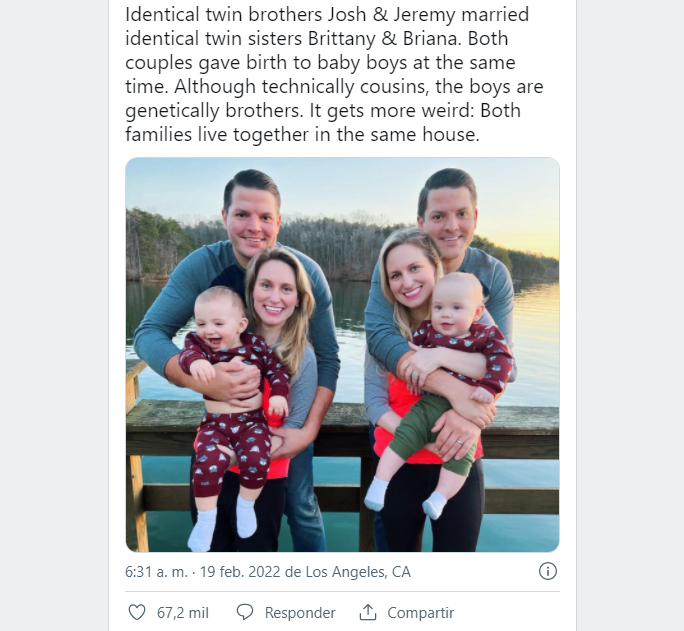 “Los hermanos gemelos idénticos Josh y Jeremy se casaron con las hermanas gemelas idénticas Brittany y Briana. Ambas parejas dieron a luz a bebés varones al mismo tiempo. Aunque técnicamente son primos, los niños son genéticamente hermanos. Se vuelve más extraño: ambas familias viven juntas en la misma casa”.