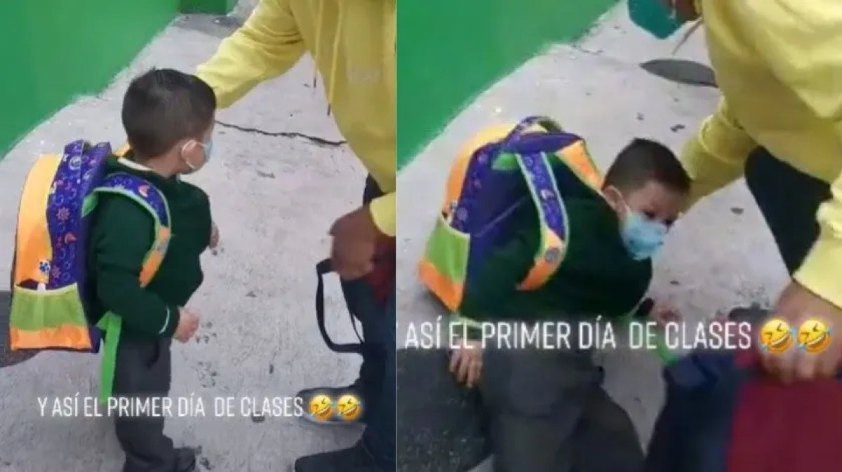 Después cuando el hombre que lo acompaña termina de acomodar la mochila sobre el cuerpo del niño e intenta caminar de la mano con él hacia la puerta de la escuela, este termina cayendo sobre su cadera y espalda debido al peso.