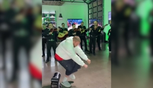 La estrella pop asistió como invitado especial a un partido de fútbol, donde fue recibido por mariachis. Inicialmente pasó de largo junto a sus acompañantes, pero al escuchar la música regresó y mostró sus mejores pasos de baile.